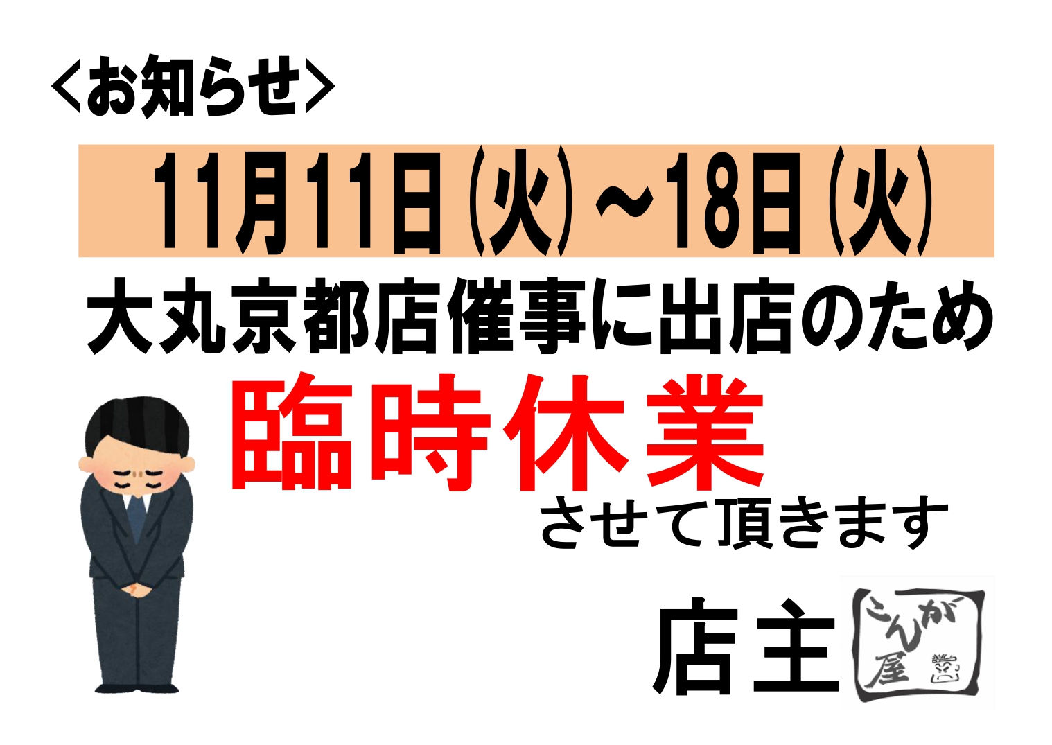 【臨時休業のお知らせ】11月11日(火)~18日(火)まで 2025.11.09 重要なお知らせ11月11日(火)~18日(火)まで催事(京都大丸百貨店)の為お休みさせていただきます。長いお休みとなります。店舗横に設置しております自販機は元気に営業しておりますので、こちらも是非ご利用ください!19日より営業します。皆様のお越しをお待ちしております!